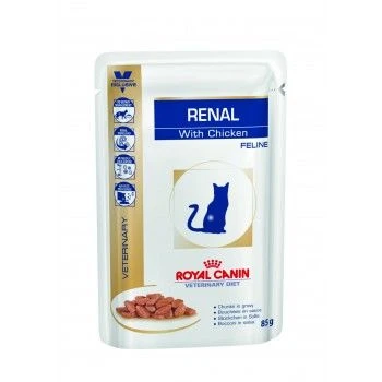 ROYAL CANIN® RENAL WITH CHICKEN Ă©mincĂ© en sauce est un aliment diĂ©tĂ©tique complet pour chats en vue de soutenir la fonction rĂ©nale en cas d’insuffisance rĂ©nale chronique, grâce Ă sa teneur rĂ©duite en phosphore et en protĂ©ines de haute qualitĂ©. RENAL WITH CHICKEN est Ă©galement indiquĂ© pour la rĂ©duction de la formation des calculs d’oxalate, en raison de sa faible teneur en calcium et vitamine D, et de ses propriĂ©tĂ©s d’alcalinisation de l’urine. RECOMMANDATIONS : Avant utilisation ou prolongation de la durĂ©e d’utilisation, il est recommandĂ© de demander l’avis d’un vĂ©tĂ©rinaire. Utiliser au dĂ©part RENAL WITH CHICKEN pour une durĂ©e allant jusqu’Ă 6